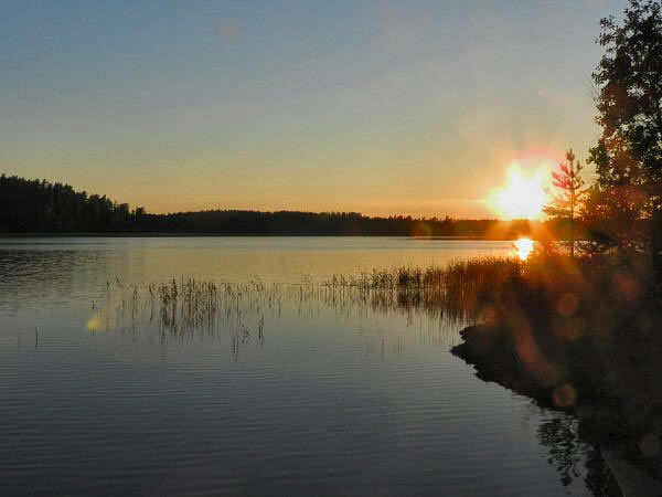 In Joensuu gaan we langs een autoruitenservice om een klein scheurtje in de voorruit te verhelpen. We doen er ook uitgebreid boodschappen, wifi’en, tanken en doen de ‘camperdingen’. We vinden bij een meertje een mooie overnachtingsplek, nadat mensen die er waren picknicken en vissen weer huiswaarts waren gekeerd, hebben we het rijk voor ons alleen, waaronder een mooie zonsondergang. Nog steeds is het zaak om de camper in de schaduw te zetten, de zon gaat pas laat onder en dan is het anders binnen nogal warm, te warm om heerlijk te slapen. |